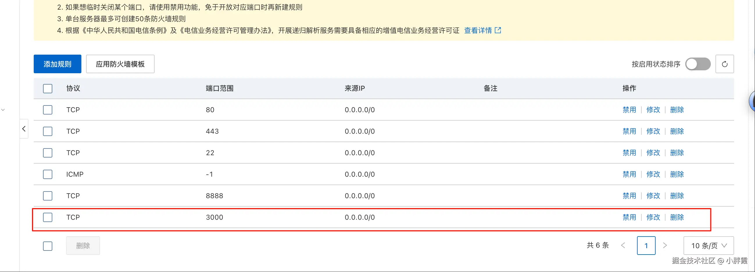 服务启动后,需要开放 3000 端口才能外部访问。因为node代码写的是3000