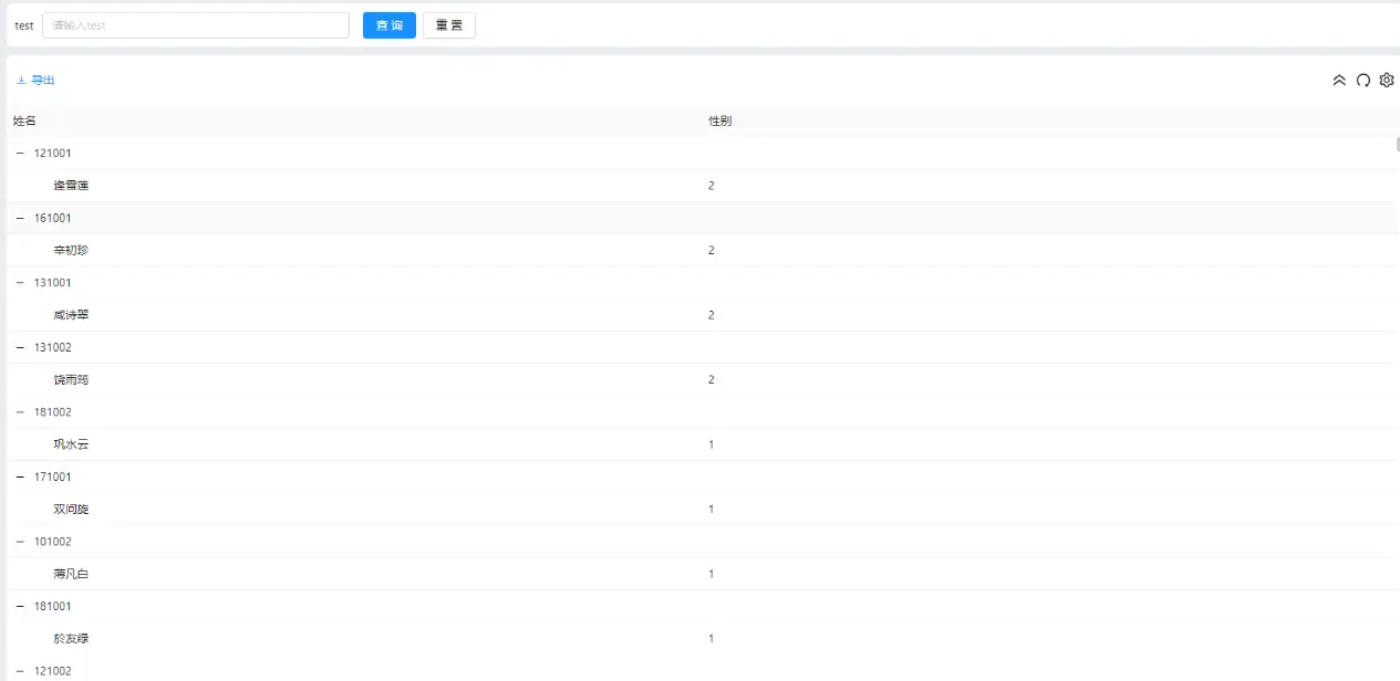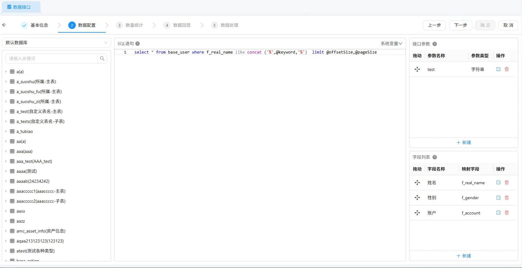 对应的单行输入框,用户输入姓名关键词(如 "张");列表字段:勾选 "姓名""账户""性别" 等字段;效果:点击查询,SQL 会按关键词筛选并分页返回数据(如第 1 页显示 20 条姓名含 "张" 的用户),比普通分页快 3 倍以上。
