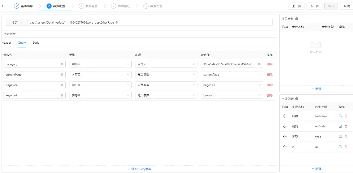 "pageSize" 参数),因无额外参数,"参数配置" 区为空;列表设计:查询字段:因无接口参数,查询字段区显示 "暂无数据",无法添加筛选条件;列表字段:勾选接口返回的字段(如 "名称""编码""类型"),配置显示列名和对齐方式;