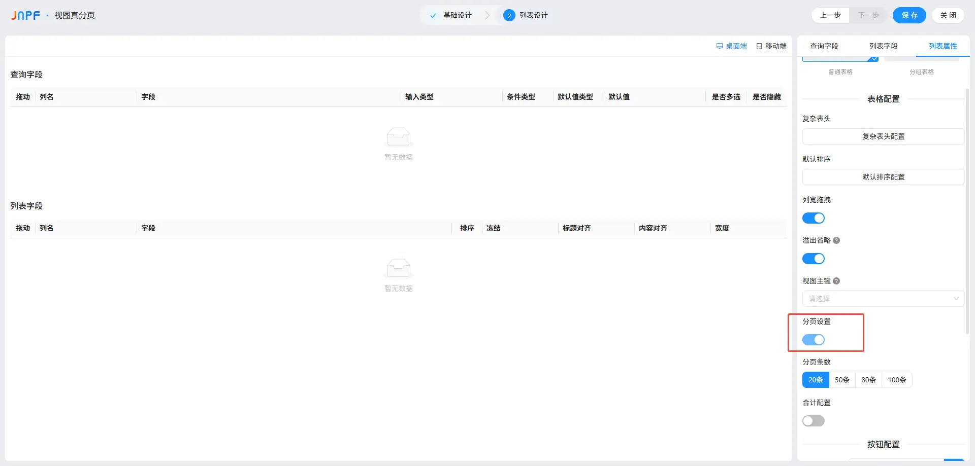分页设置:真分页启用后,分页设置会被锁定(无法关闭),分页条数可设 20/50/80/100 条 / 页;