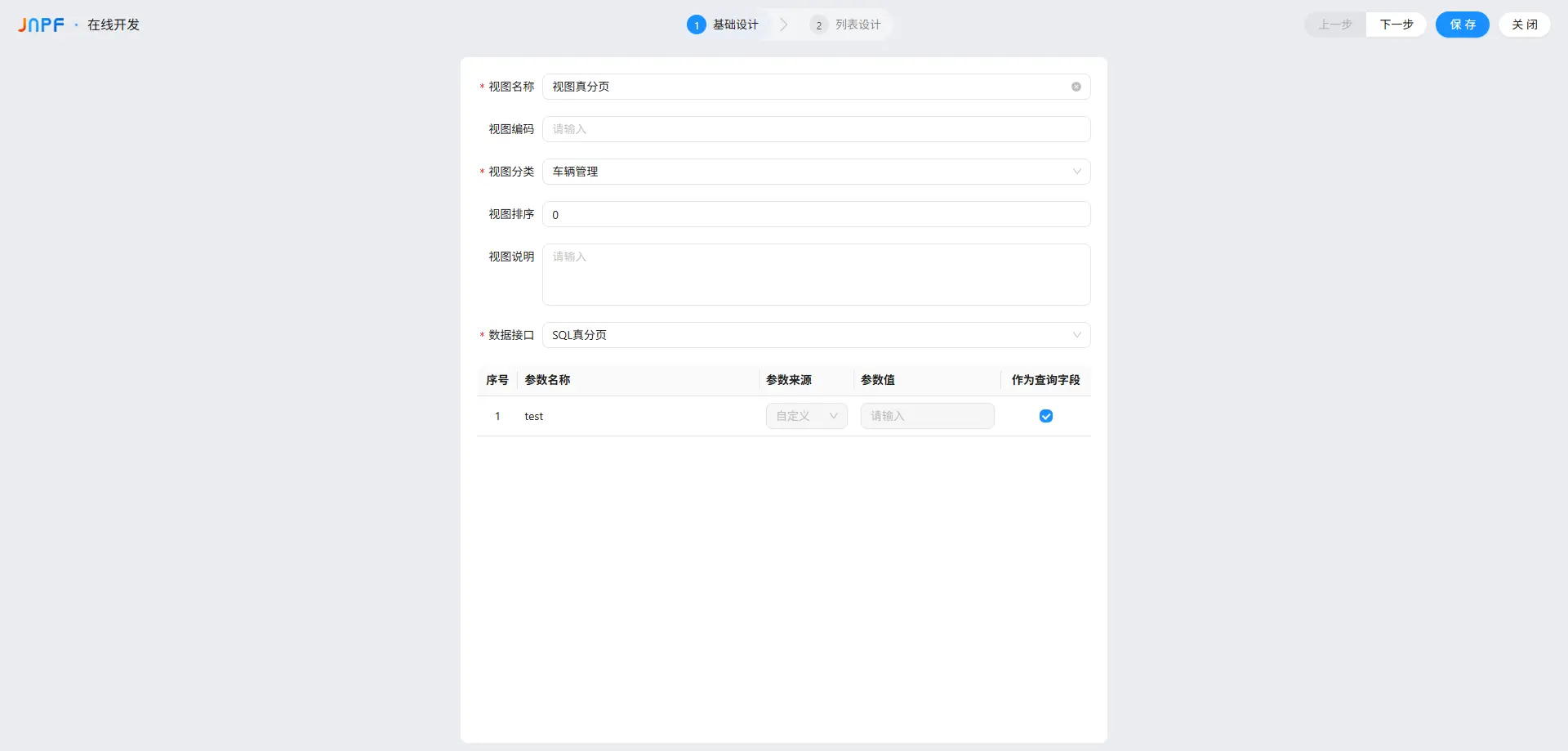 视图配置 :基础设计:选择该 SQL 真分页接口,在 "参数配置" 中勾选
