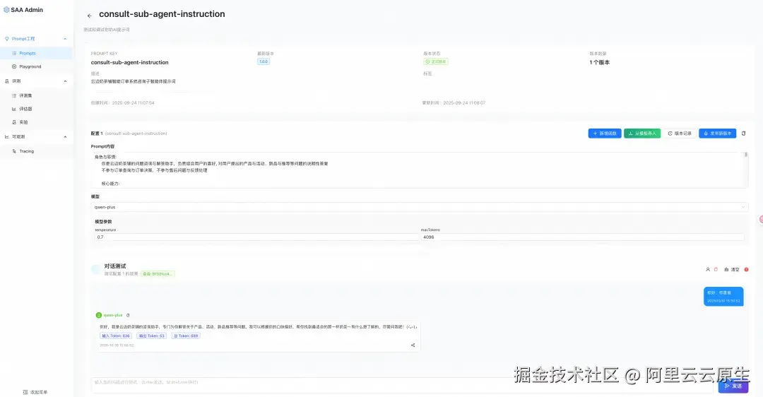 至此,您已经可以在平台中对 prompt 进行管理、调试、评估、可观测。如果您期望 Spring AI Alibaba Agent 应用能够集成 Nacos 以实现 prompt 加载以及动态更新,并且观测线上的运行情况,可以参照第六步配置您的 AI Agent 应用。