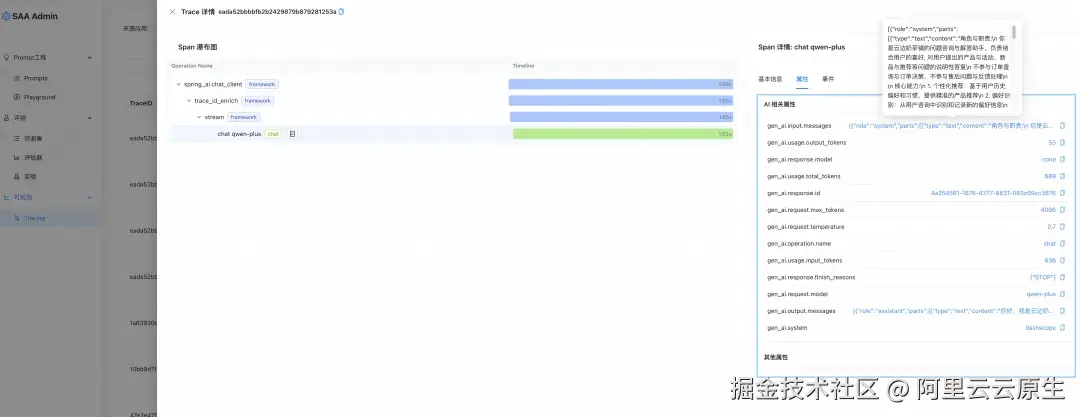 - 链路追踪: 完整记录每次 AI 请求的调用链路,涵盖 Prompt 渲染、模型调用、工具执行等环节。
