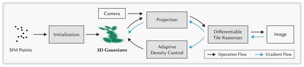 **损失计算与反向传播:**比较渲染输出与真实图像,计算重构损失并通过反向传播优化高斯椭球的各项属性参数;