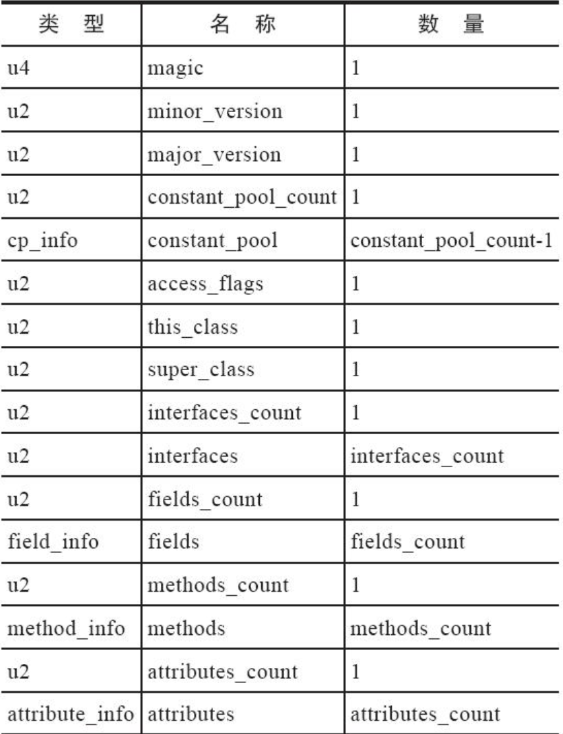类索引(this_class)和父类索引(super_class) 都是一个u2类型的数据,而**接口索引集合(interfaces)**是一组u2类型的数据的集合。这三个数据类型决定了Class文件对应的类的继承关系。