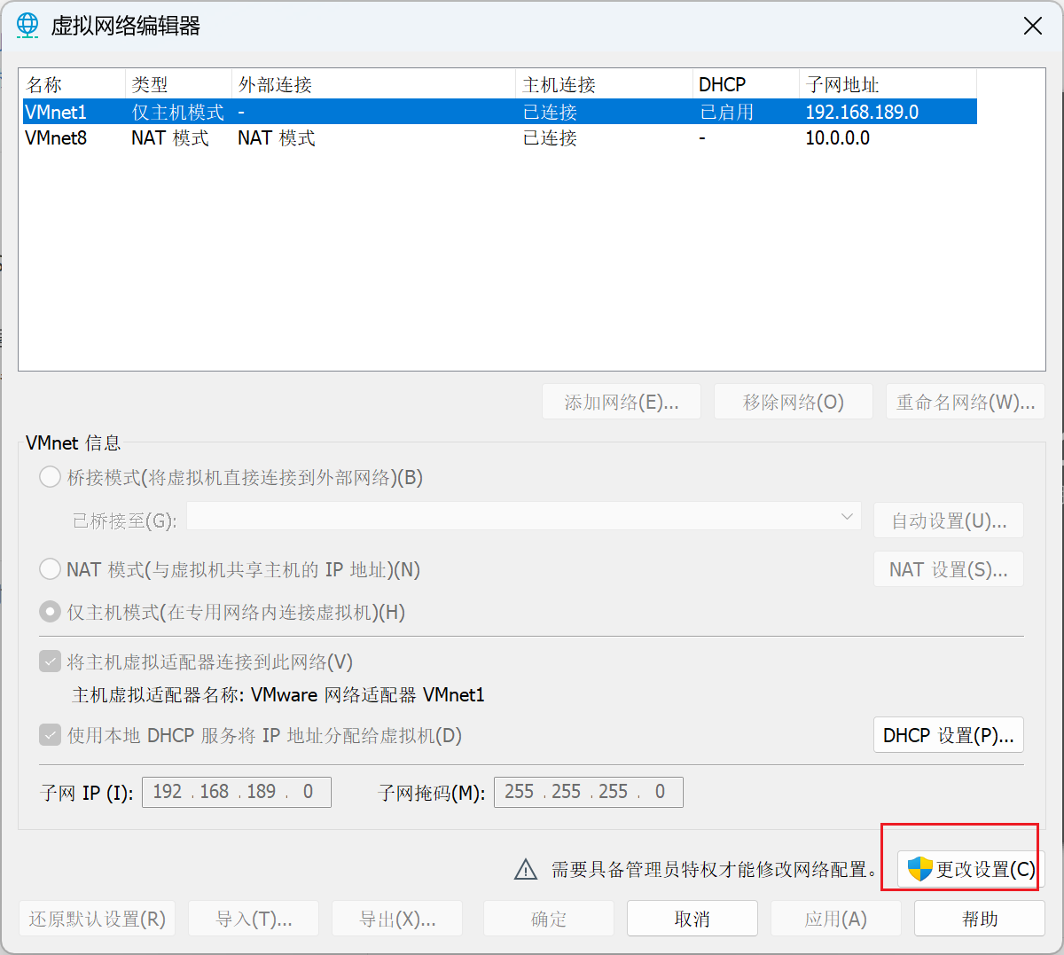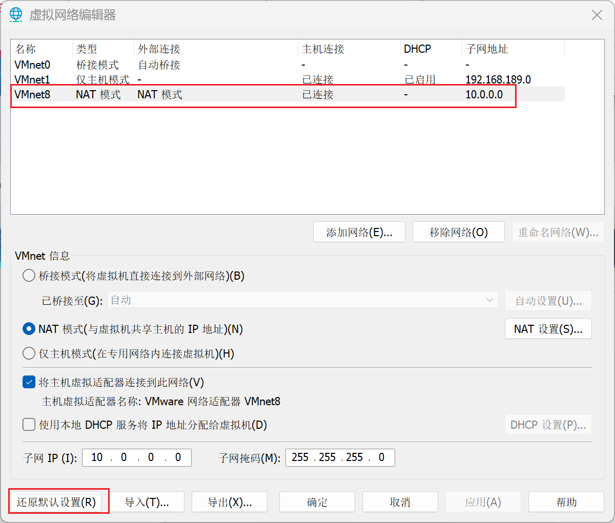 Vmware------编辑------虚拟网络编辑器------更改设置------还原默认设置