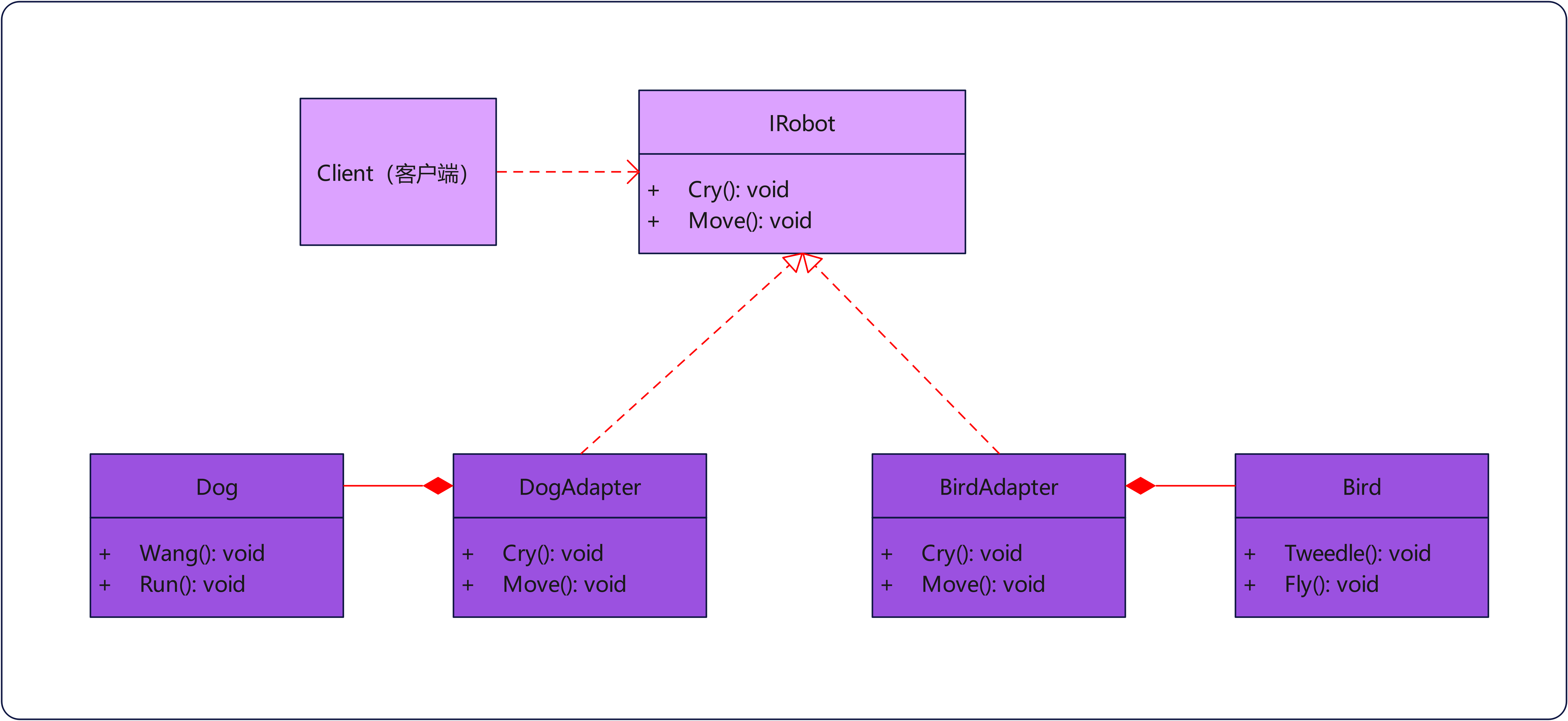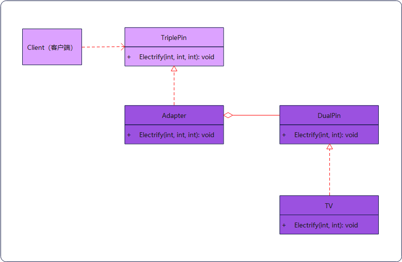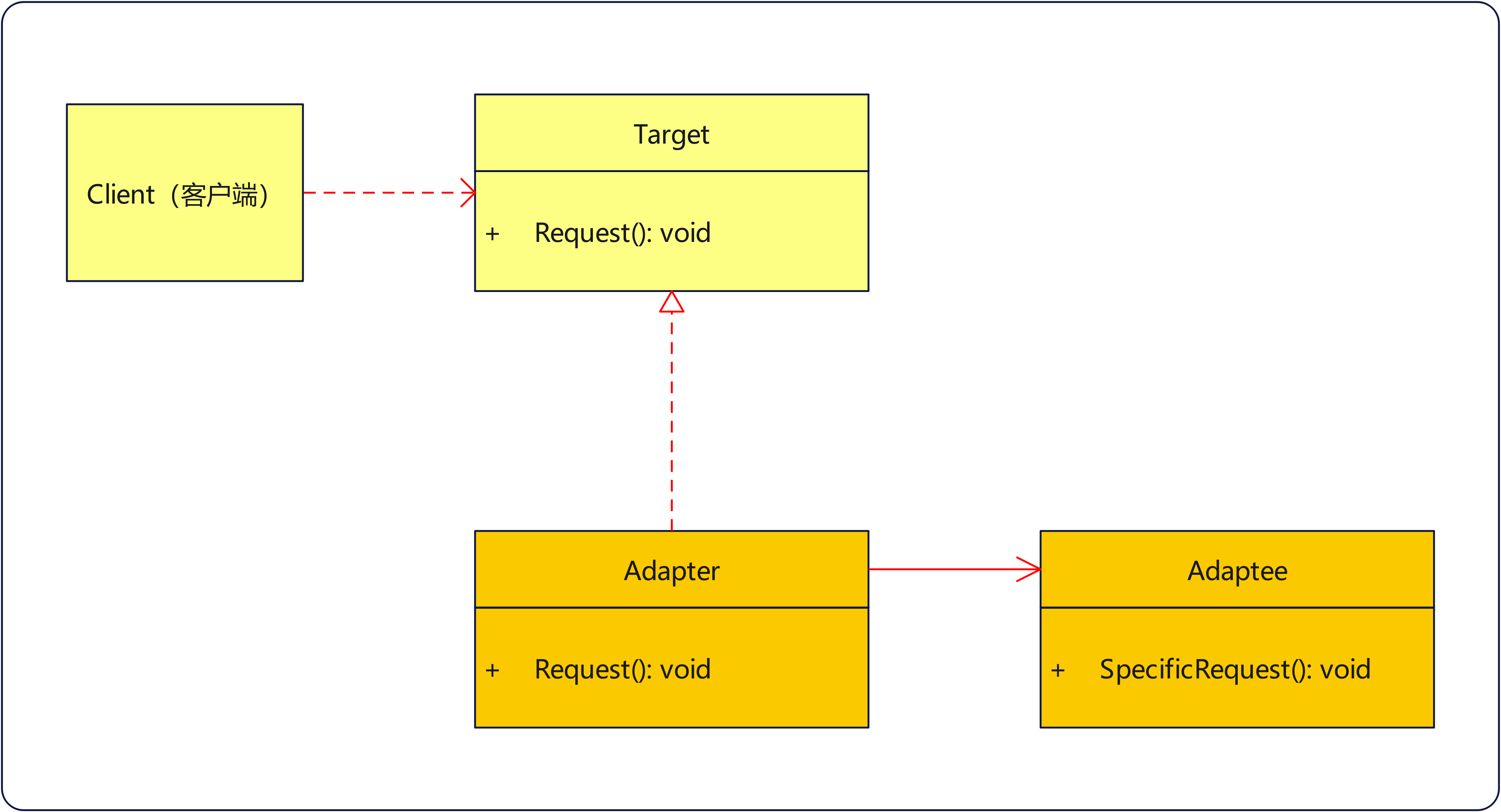 Adapter(适配器类):适配器可以调用调用另一个接口,作为一个转换器,对Adaptee和Target进行适配。在对象适配器中,它通过继承Target并关联一个Adaptee对象使二者产生联系。