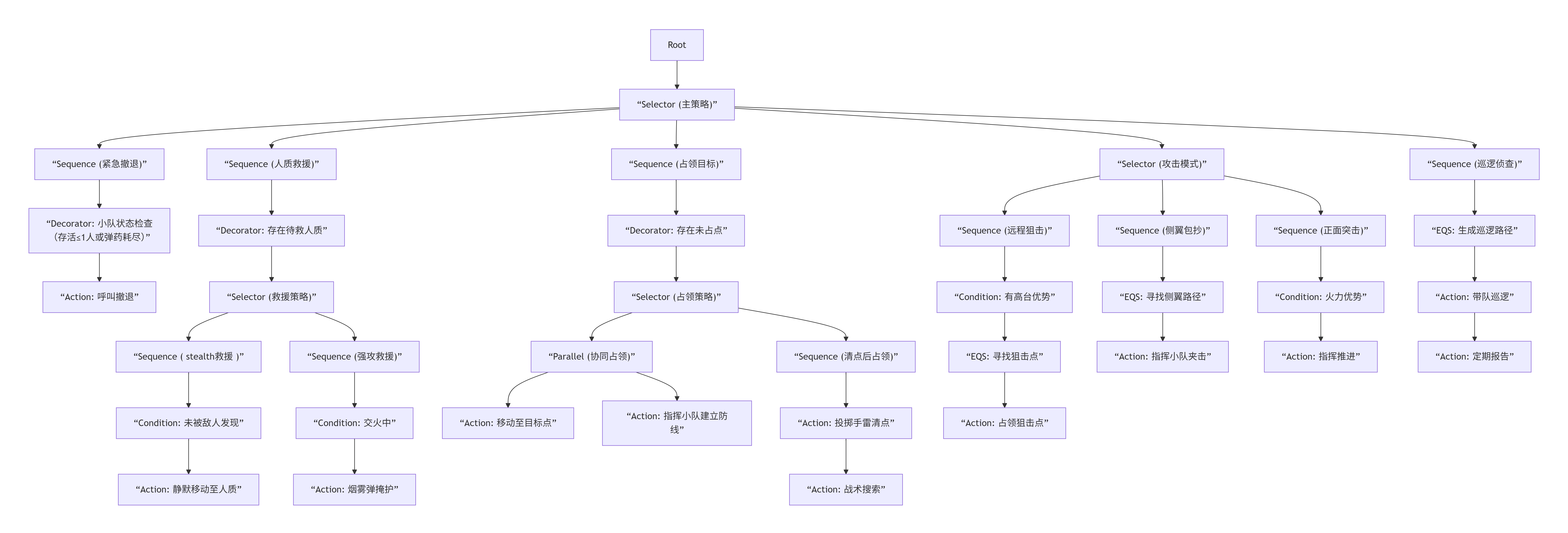 Root → Selector(主策略) → Sequence(自救) [条件通过] → Action:逃跑并呼救