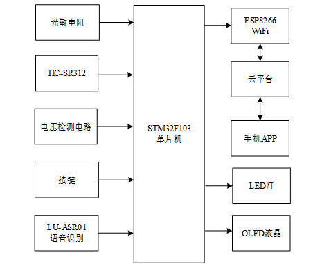 如图2-2所示为展示柜灯光控制系统的硬件组成,主控制器采用STM32F103单片机,光照检测采用光敏电阻,人体检测采用HC-SR312,故障检测采用电压检测电路,语音识别采用LU-ASR01模块,液晶采用OLED12864,WiFi采用ESP8266,上位机采用手机和云平台。