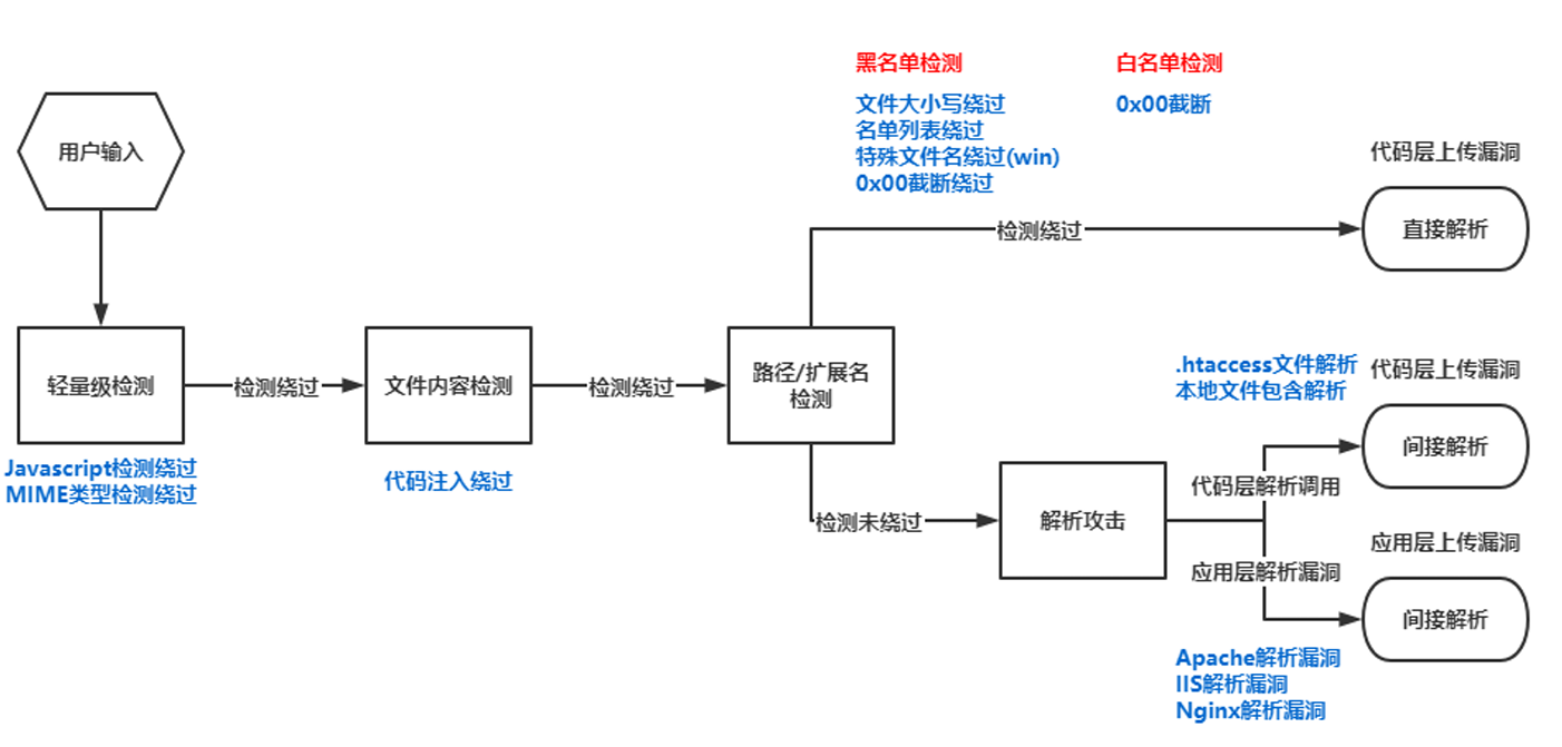 - 我们将根据文件上传检测的技术路线介绍相关的绕过技术。