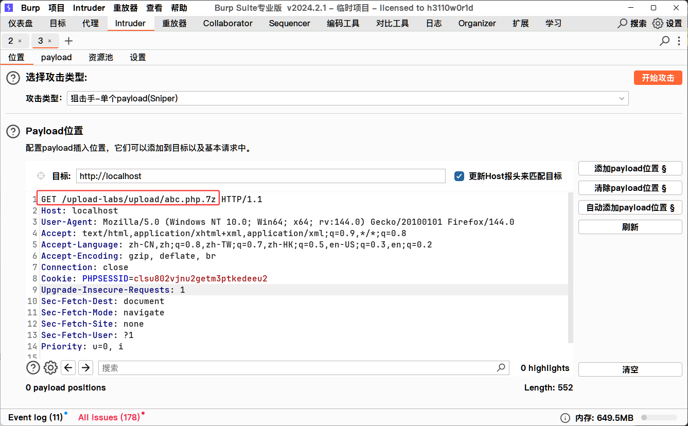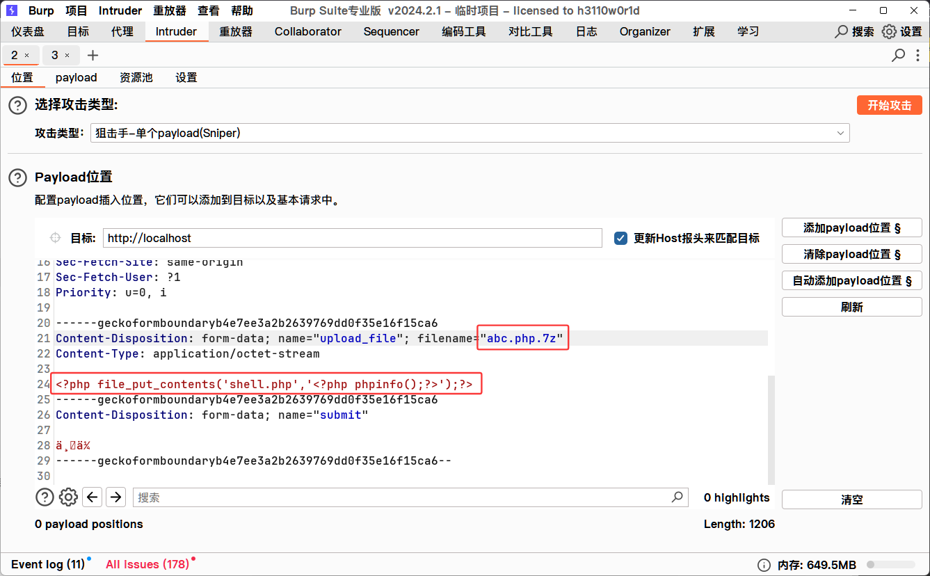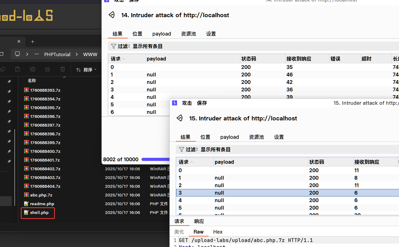 由于这里做了重命名处理,我们尽管上传了如"abc.php.7z"这种文件,但是存在服务端就只剩下"随机数+.7z"的文件名了,不是可执行文件,不可以执行,所以我们需要在文件被重命名之前访问这个文件,利用file_put_contents留下一个php文件,达到稳定连接。这里就和上一关的条件竞争一样了,大量重放两个数据包。