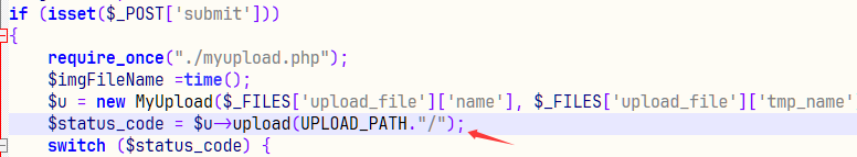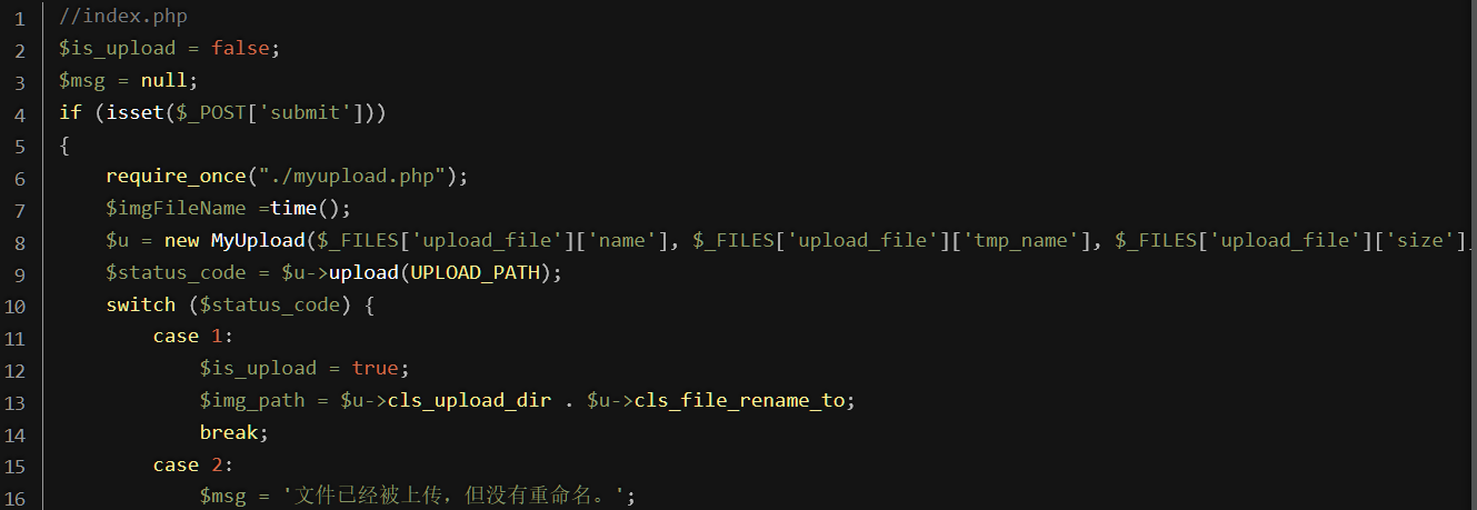 接下来,来审计代码,index.php就是使用MyUpload类来处理上传文件,根据MyUpload类返回的值来打印对应上传状态信息。