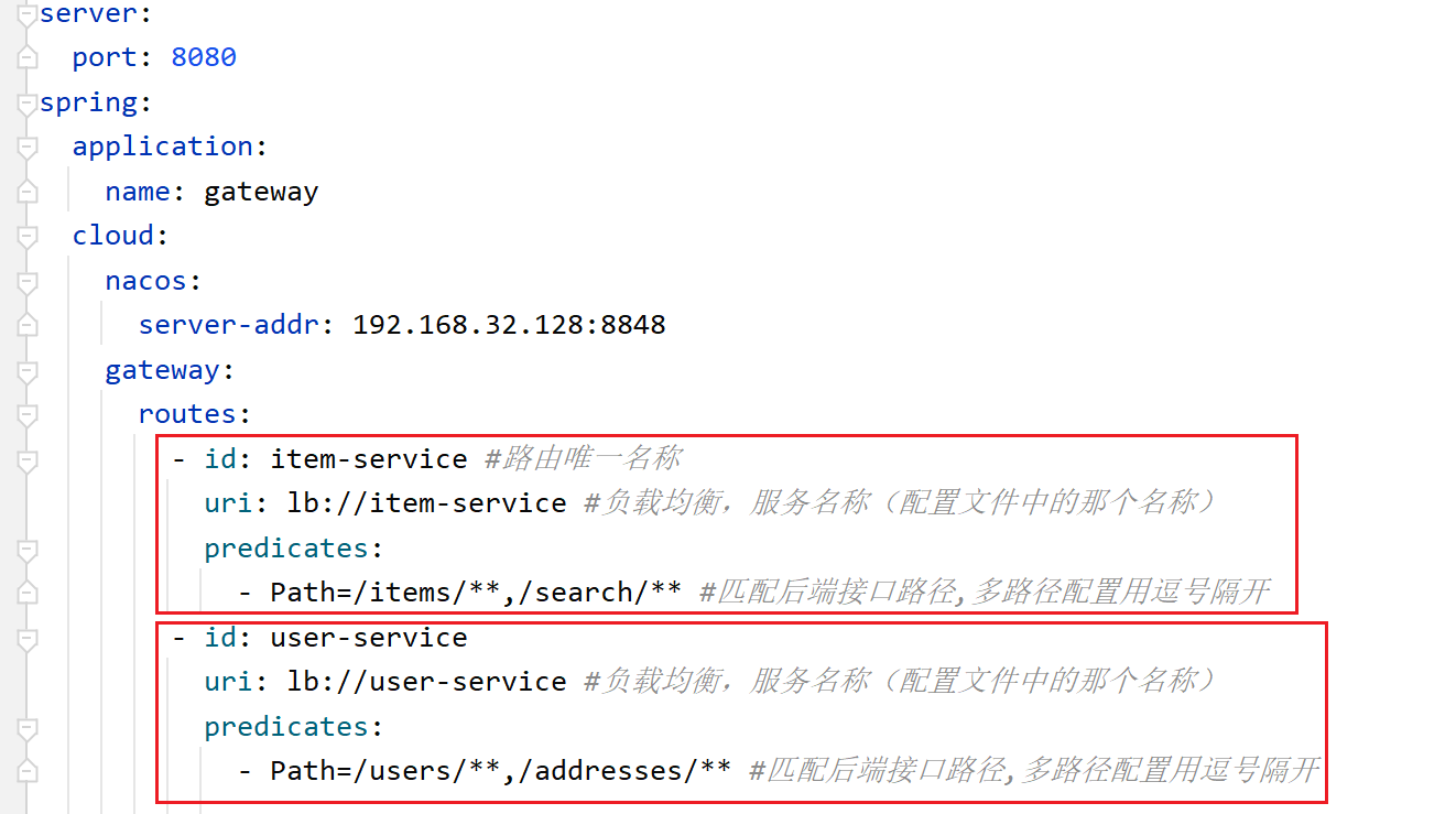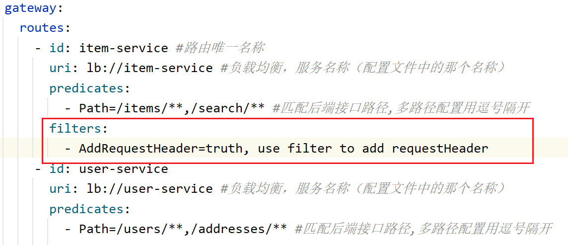 这里每个路由id都是唯一的;uri: lb://item-service,lb代表这里采用负载均衡(默认轮询),item-service代表服务实例名称,这里会根据服务名称从注册中心获取所有对应服务实例然后采用负载均衡挑选一个实例;predicates:代表匹配后端接口的路径,如果有多个Controller路径,用逗号隔开。