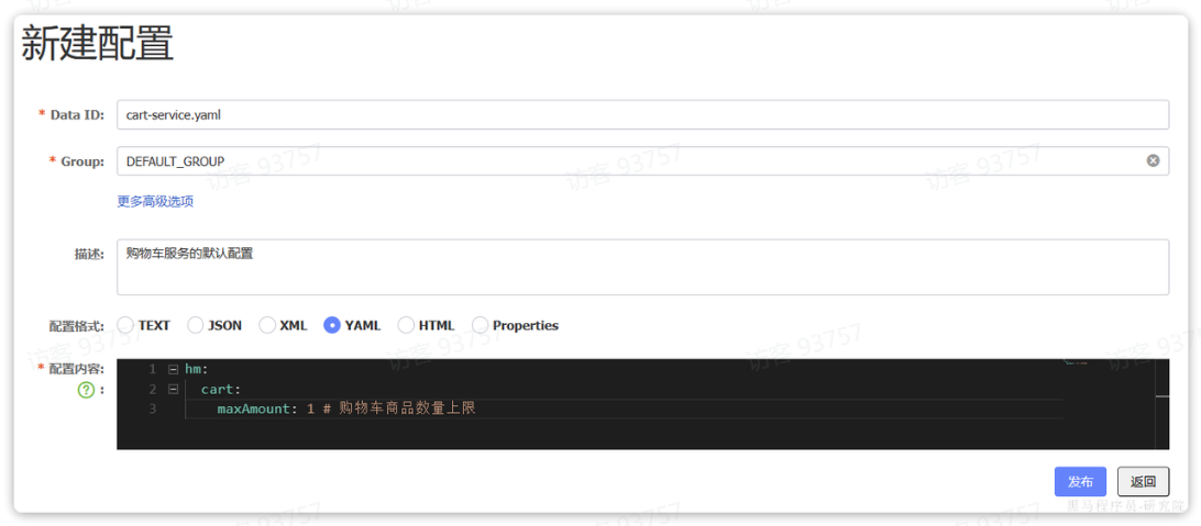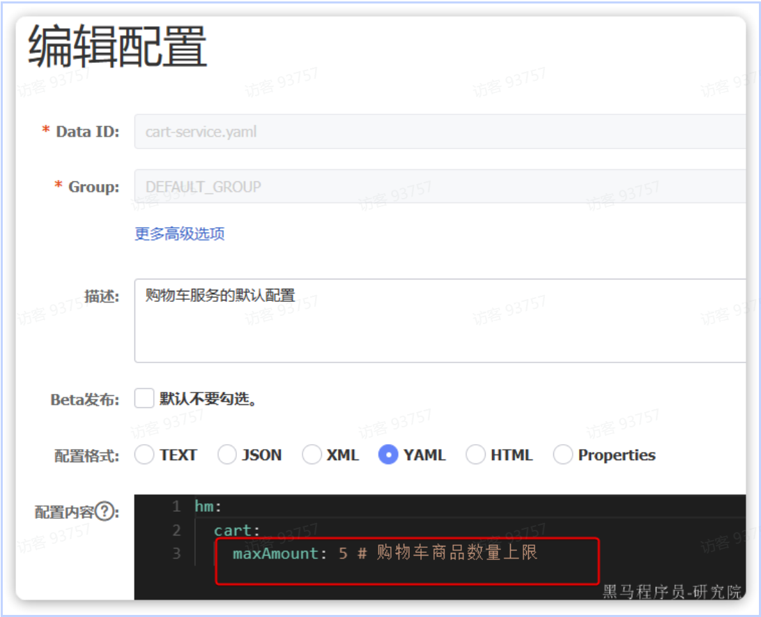 首先,我们在nacos中添加一个配置文件,将购物车的上限数量添加到配置中:注意文件的dataId格式: