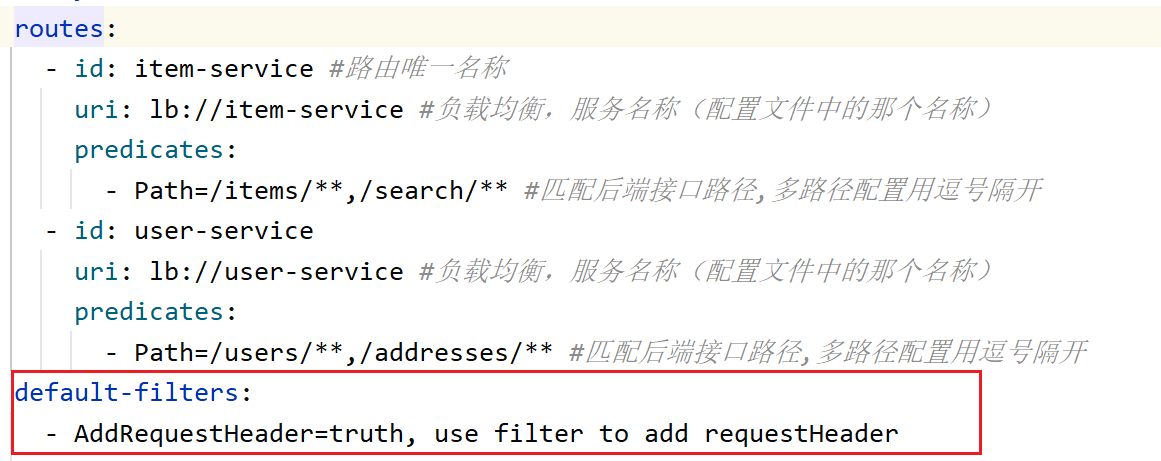 如果想要添加公共的过滤器,使用跟routes同级的default-filters,在其下添加过滤器配置即可。