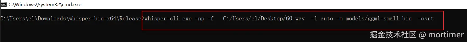 whisper-cli -np -f "C:\Users\c1\Desktop\60.wav" -l auto -m models/ggml-small.bin -osrt