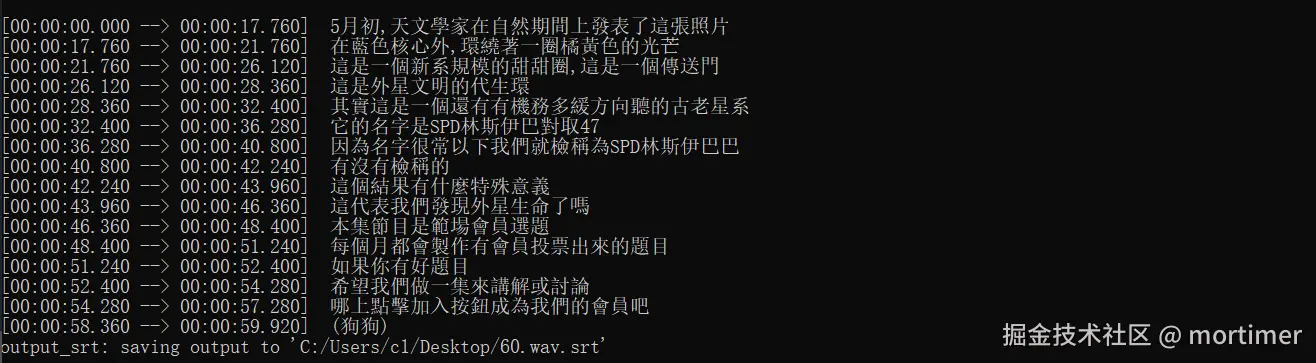 程序会开始运行。等待执行完毕后,你会在源文件所在的目录(这个例子中是桌面)看到一个新生成的 60.wav.srt