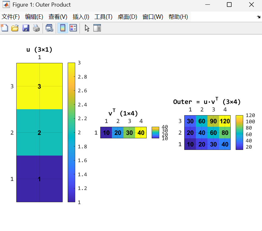 nexttile; showMatrix(Outer, 'Outer = u·v^T (3×4)');