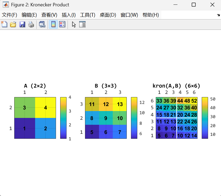 % A ⊗ B:将 A 的每个元素 a_ij 作为系数,乘以矩阵 B,形成对应的块并拼接