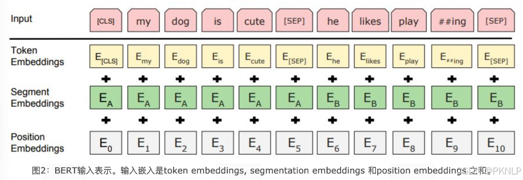 - Token Embeddings 是词嵌入张量, 第一个单词是CLS标志, 可以用于之后的分类任务.
