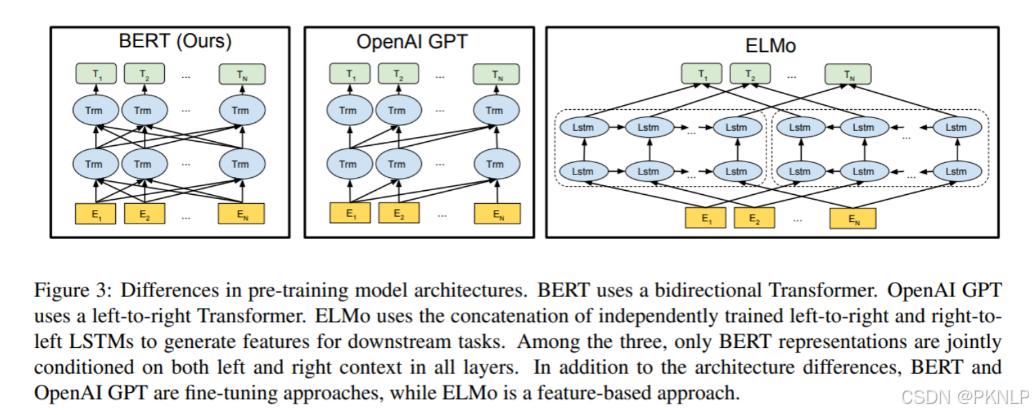 总体架构: 如下图所示, 最左边的就是BERT的架构图, 可以很清楚的看到BERT采用了Transformer Encoder block进行连接, 因为是一个典型的双向编码模型.