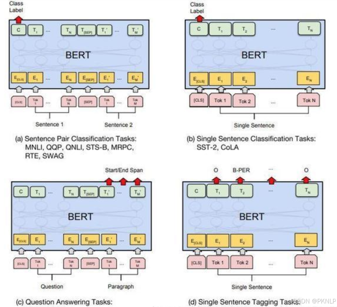 - 对于不同的任务, 微调都集中在预微调模块, 几种重要的NLP微调任务架构图展示如下