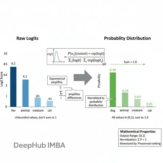 P(w_i | context) = exp(logit_i) / Σ_{j=1}^V exp(logit_j)