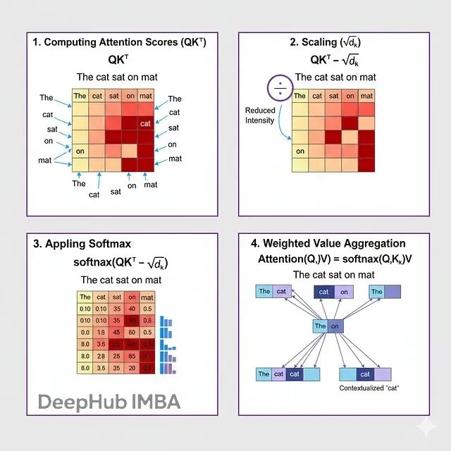 点积QK^T生成一个n×n的矩阵,元素(i,j)代表token i对token j的关注度。点积越大说明query和key向量在语义或句法上越相似。