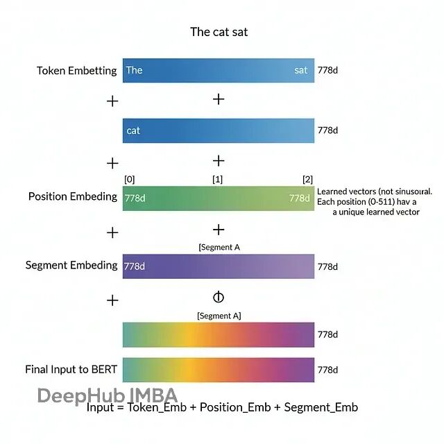每个token ID转成768维嵌入(BERT-base)。加上位置嵌入和段嵌入: