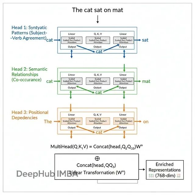 BERT不是算一个注意力函数,而是并行算h个(BERT-base是12个头,BERT-large是16个)。每个头学习关注输入的不同方面: