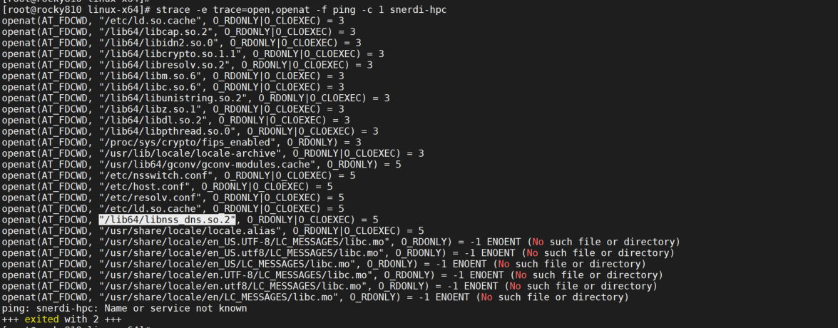 [root@rocky810 linux-x64]# strace -e trace=open,openat -f ping -c 1 snerdi-hpc