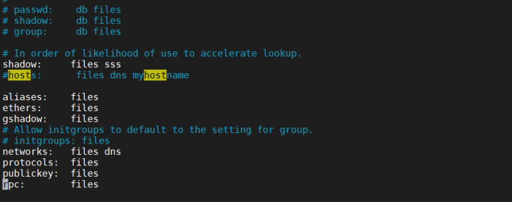 存在上述内容,那么就会按照这一行的配置顺序进行解析hosts: files dns myhostname 先走/etc/hosts进行解析 如果/etc/hosts没有解析成功,会进行dns解析 最后如果上面两步都没有解析成功,会再查看当前主机名,即hostnamectl所配置的主机名