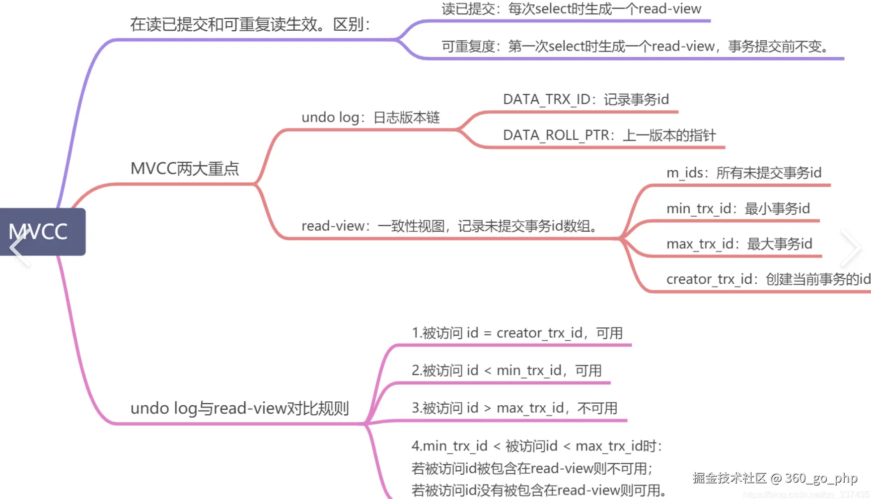 原理:MVCC通过为每行数据维护多个版本来实现并发控制。每个事务对数据的操作都会生成一个新的版本,并且每个版本都包含了事务的开始时间和结束时间(或提交时间)。这样,事务在执行过程中可以看到自己的数据修改,但看不到其他事务未提交的数据。