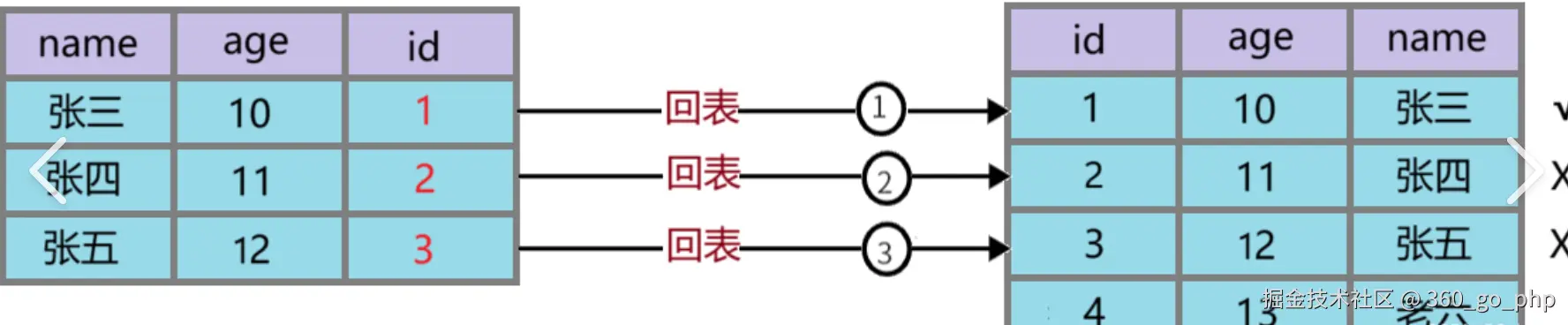 非聚簇索引:查询时需要通过索引查找数据的指针,然后再去数据表中获取数据,性能相对较低。