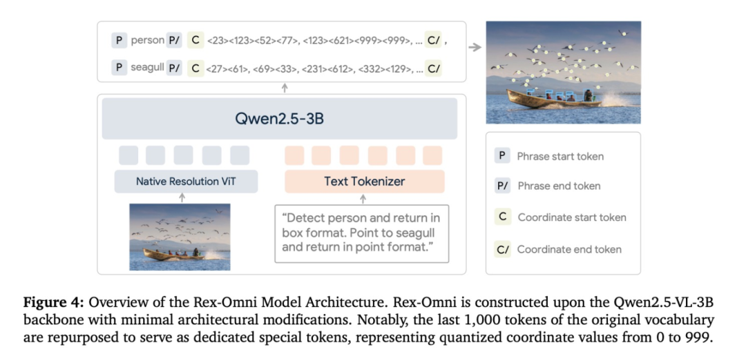 **任务范式创新:**基于Qwen2.5-VL-3B架构,复用词汇表最后1000个token作为坐标专用token,无需大幅改动模型结构。