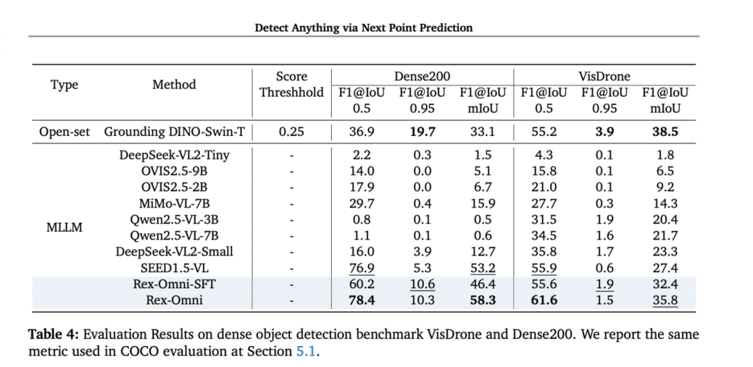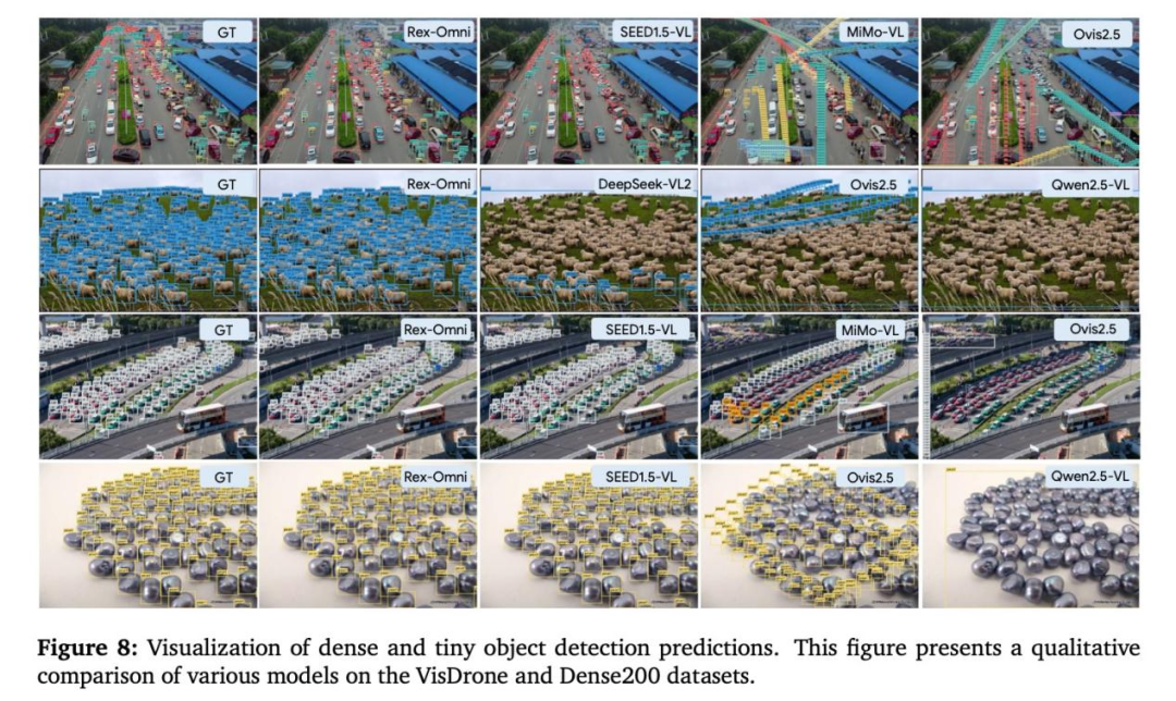 **密集小目标检测:**在Dense200数据集上取得78.4的F1@0.5分数,有效解决了MLLM在密集小目标上的传统弱点。