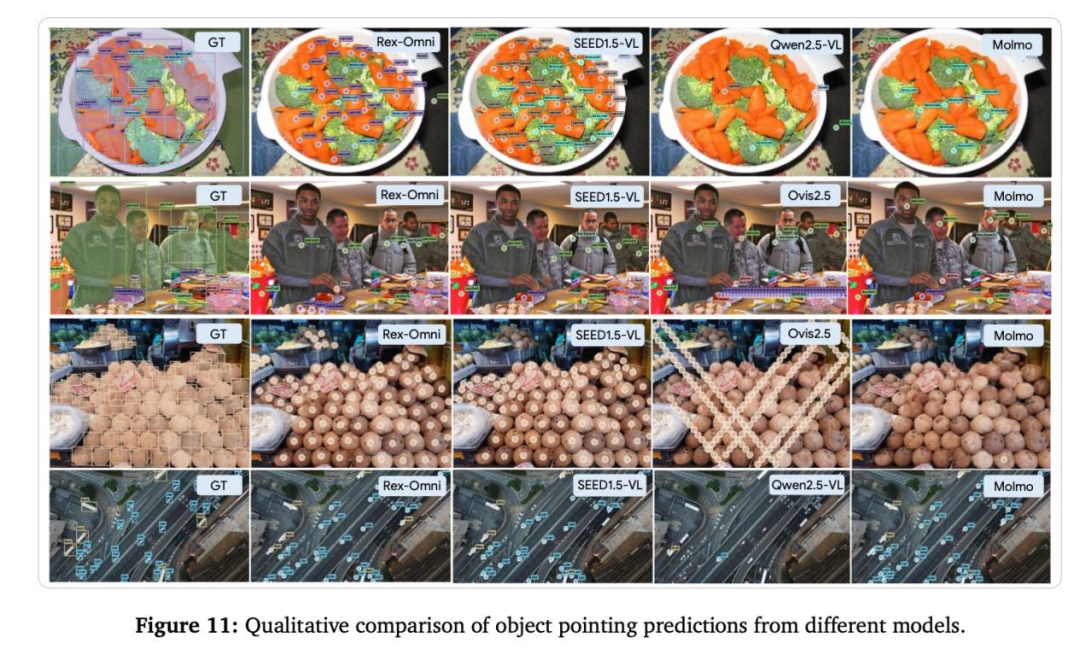 **数据引擎支撑:**团队构建自动化数据流水线,整合公共数据集与自产数据,最终形成2200万样本的训练集,覆盖定位、指代、指向等多种任务。