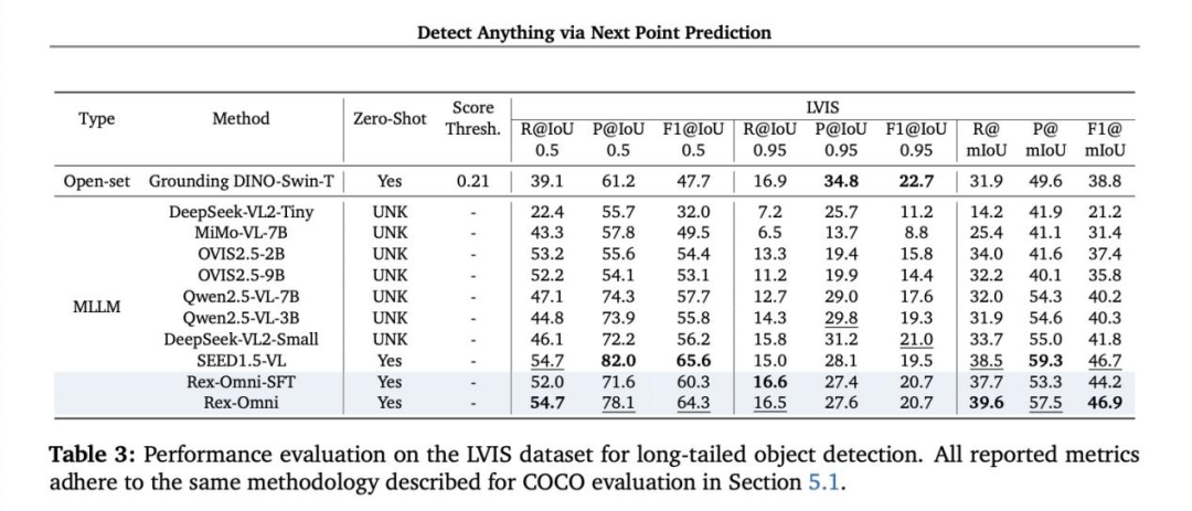 **COCO数据集:**零样本设置下,IoU阈值为0.5时,性能不仅超越之前最强MLLM SEED1.5-VL,甚至超过了为COCO专门训练的传统检测器DINO-R50。