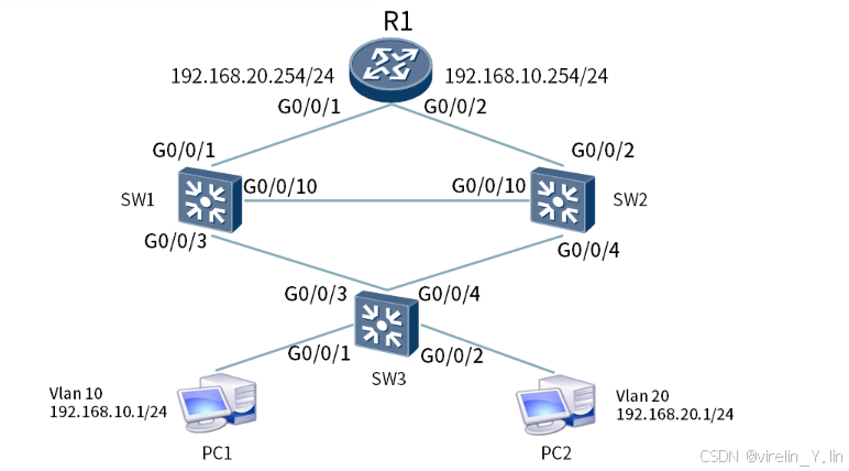 [SW1]vlan batch 10 20 // 创建vlan10 和vlan20