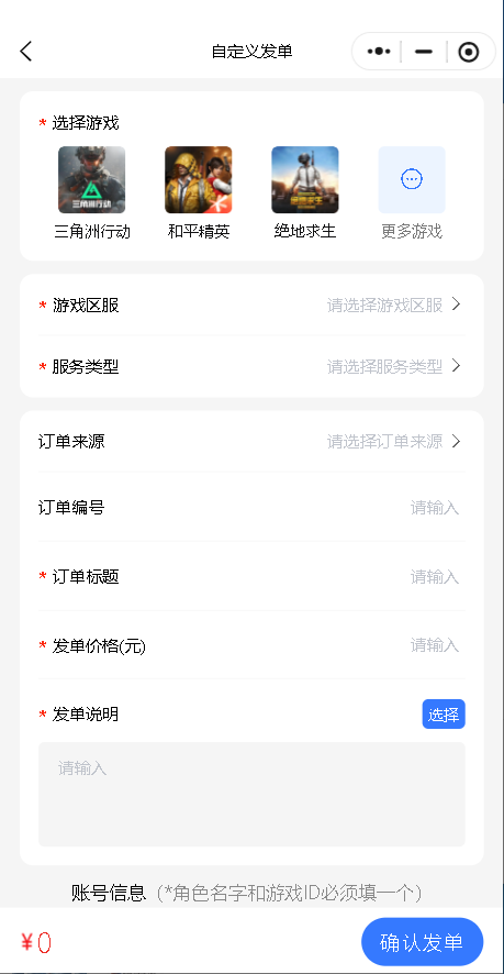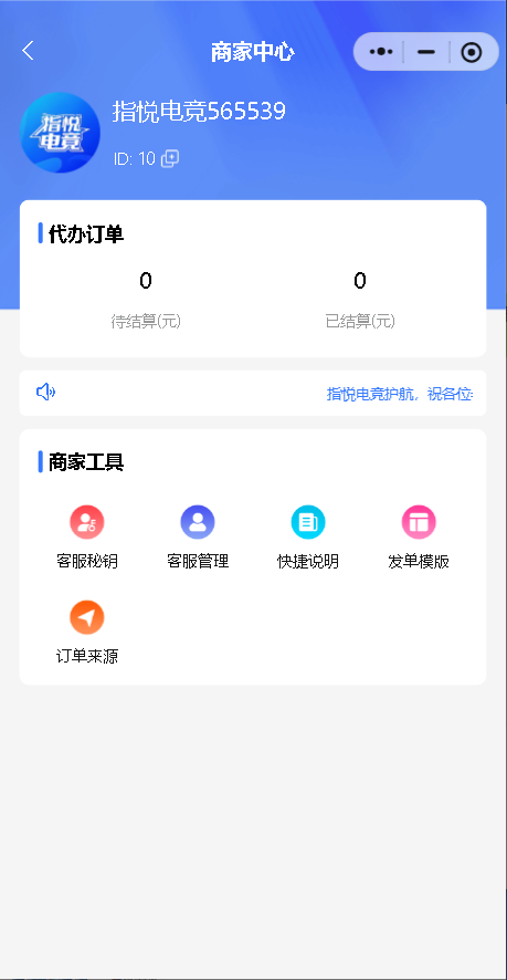 功能列表:商家入驻 管事入驻 打手入驻 快捷发单 自定义发单 发单列表 商家中心 客服密钥 发单模板 订单来源 余额提现 即时通讯 我的发单 我的接单 订单裁决 打手排行榜 邀请排行榜 管理后台 等