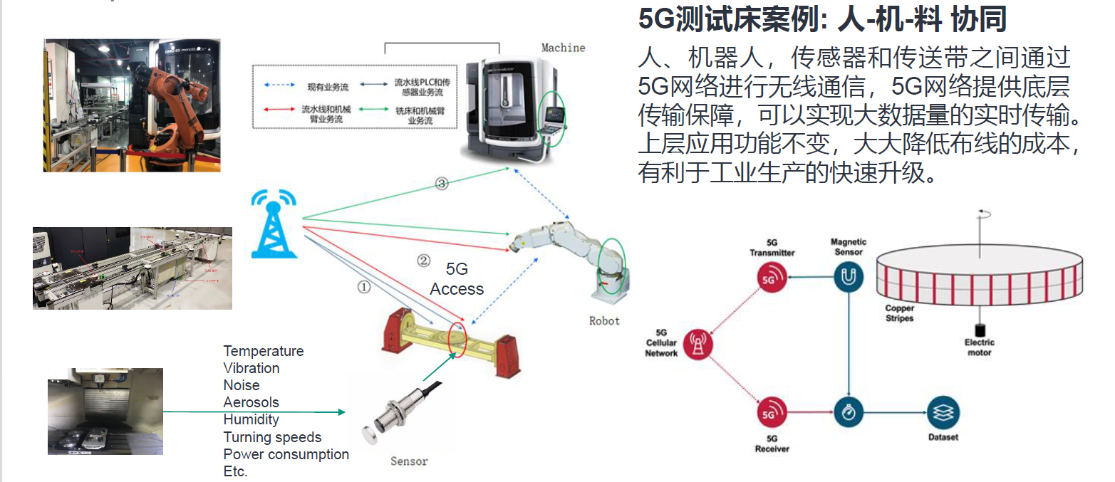 5G解决方案:通过5G网络实现无线通信,人、机器人和传感器之间可以实时交换数据,传送带根据生产需求动态调整运行速度。