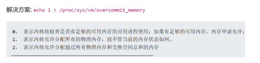 处理,执行这段命令即可:echo 1 > /proc/sys/vm/overcommit_memory