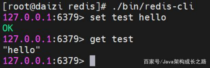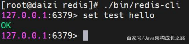 此处我们通过下面命令随便set一个字符串类型的值,key是test,value是hello: