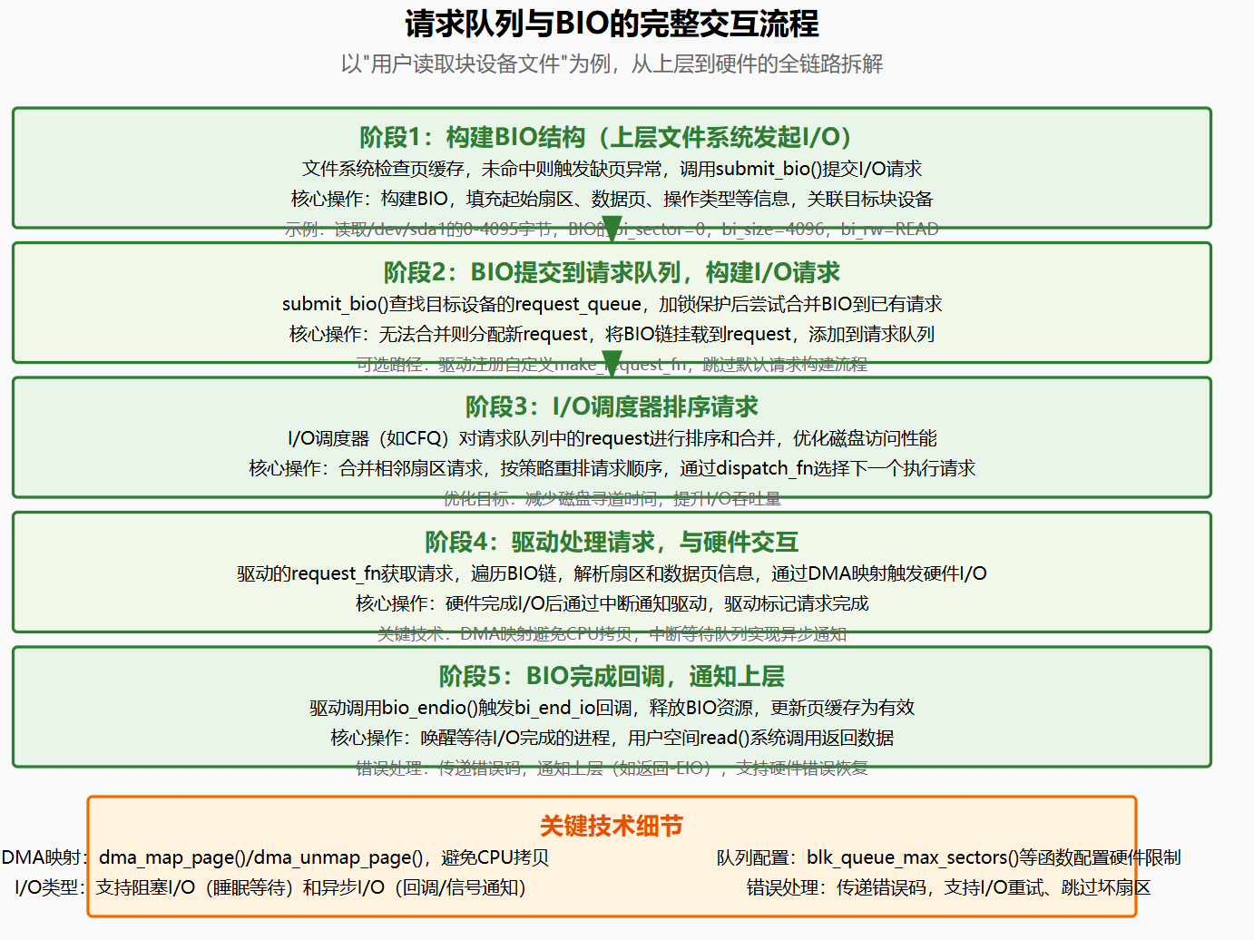 从上层发起I/O请求到硬件执行完成,请求队列与BIO的交互可分为5个核心阶段。以下以"用户读取块设备文件"为例,拆解完整流程。