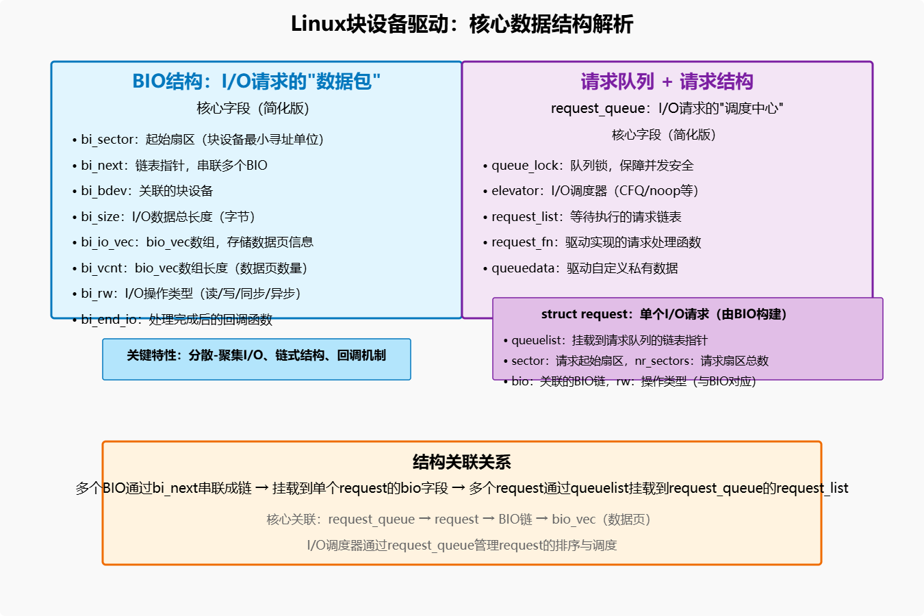 Linux块设备驱动中,请求队列与BIO的交互是连接软件与硬件的核心纽带: