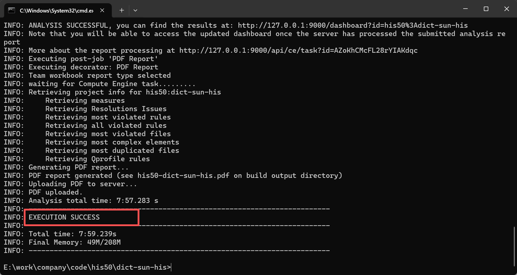 sonar-project.properties配置文件同级下,cmd终端,输入命令 sonar-scanner 开始进行代码检测,如下图,最终显示EXECUTION SUCCESS即为成功。