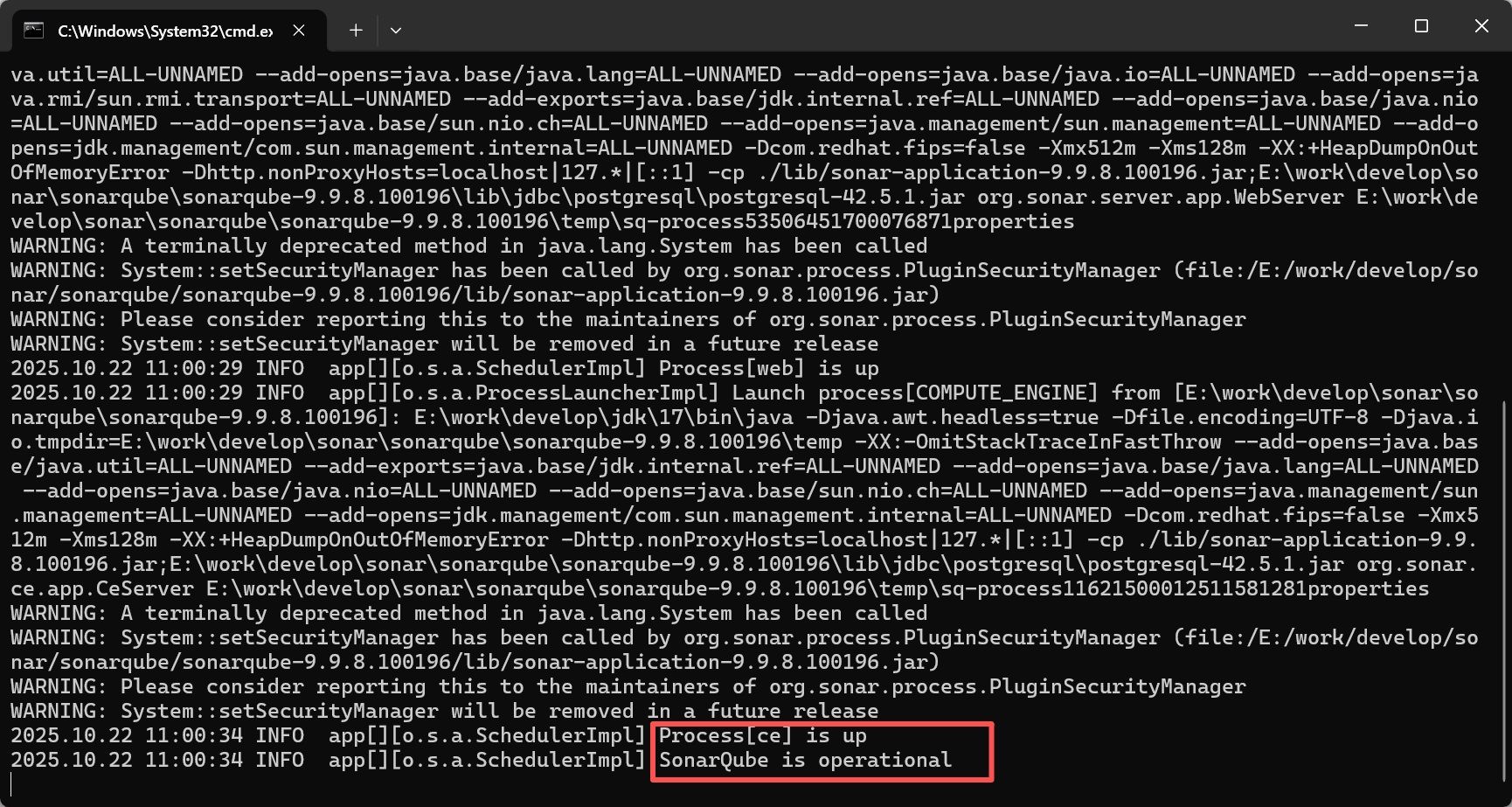 如图,cmd中直接运行StartSonar.bat命令(或直接双击,我是直接cmd中命令启动的,一开始安装25+版本的时候,直接双击,报错后直接终端窗口闪退)
