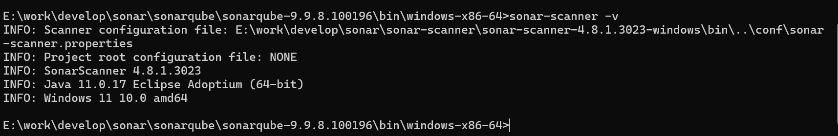 任意位置,cmd,输入命令 sonar-scanner -v,能够如图显示出版本信息即可(不要被输出的java 11.xxx误解!!不要被误解需要jdk11,jdk就用之前说的17就行!!!)
