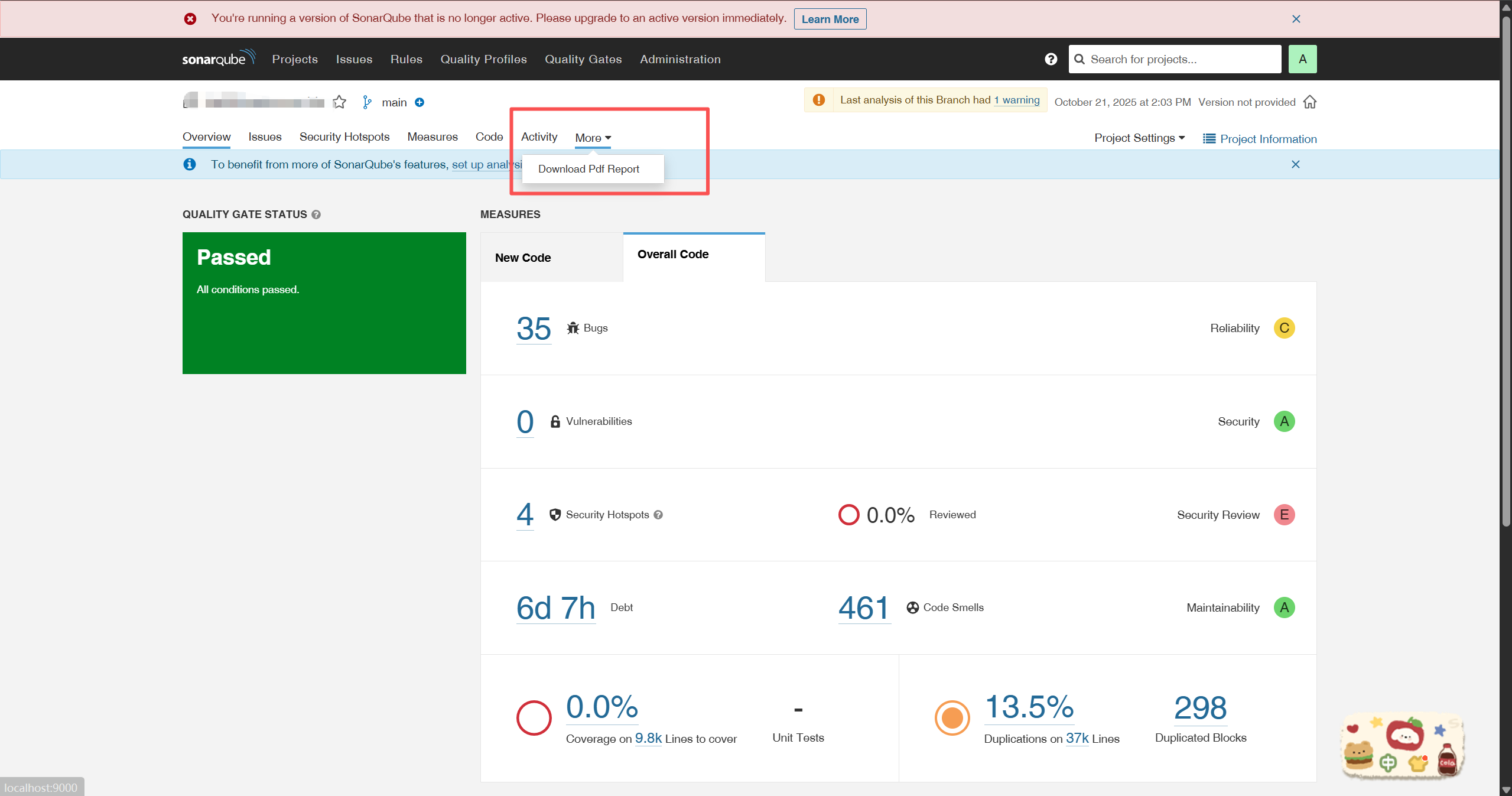 然后进行后面的代码检测。(如果说还没安装这个PDF插件前,就进行了代码检测,那么需要在SonarQube中删除后,重新进行代码检测)