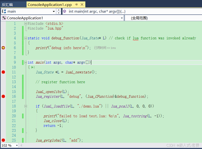 为了确认add函数是什么时候执行的,我们添加了一个debug函数,可以在main函数里面设置一些断点。通过单步调试的方式,就知道lua中的add函数是什么时候执行的了。